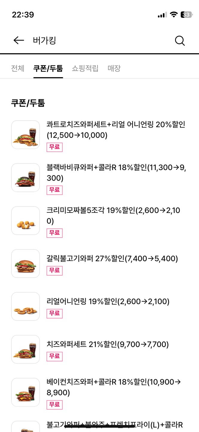 오케이케시백 앱에서 투툼 검색에서 버거킹을 선택하신 후에 쿠폰/투툼 쿠폰을 선택하시면